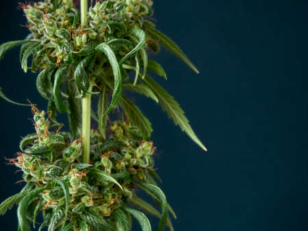 Detail of cannabis flower on blue background, medical marijuana concept. Growing cannabis indica, hemp CBD