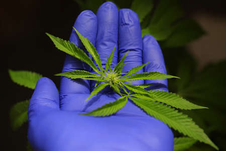 close up of cannabis leafs and narcotic bud being checked by human hand wearing medicinal gloves.