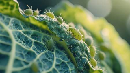 A detailed close-up of green aphids resting on a cabbage leaf covered with morning dewdrops. This image captures the delicate balance of nature, showcasing both pest and plant life.