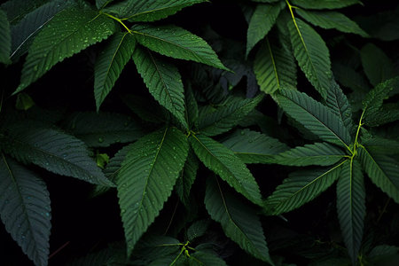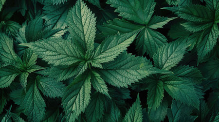 close-up shot of many marijuana leaves overlapping each other, creating a vibrant and lush green background. Generative AI