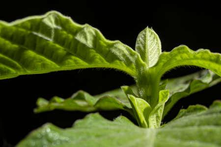 Leaves and Strokes of a young cannabis plant at the stage of veg plant medical marijuana Marijuana leaves, A beautiful leaf of cannabis, marijuana, herbal hands at the man, indoor cultivation