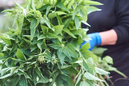 Woman picking fresh nettle leaves with protection gloves. Stinging nettle leaves background.