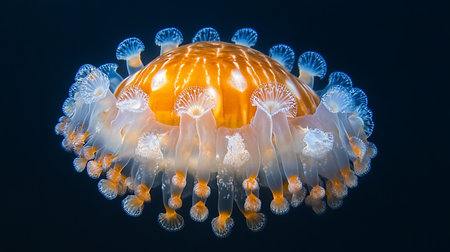 A vibrant upside-down jellyfish with a golden-orange bell and translucent tentacles tipped with blue and orange, showcasing intricate details.