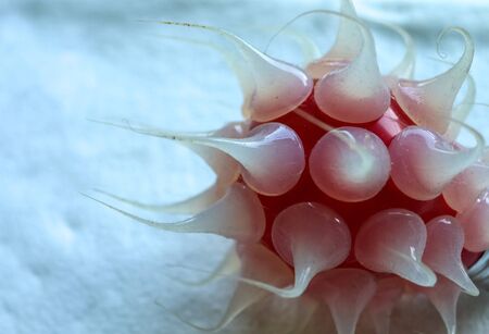 A closeup of the tentacles, each petal with tiny beads against an isolated black background.