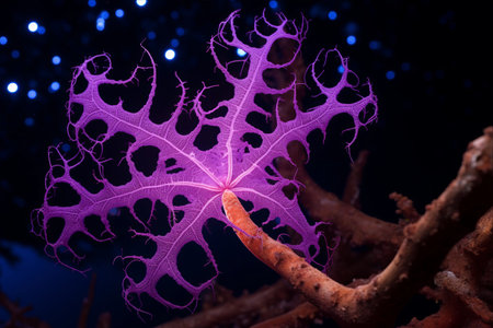 A close-up image showcases a star-shaped marine invertebrate, radiating with shades of purple and red. The translucent body reveals internal structures, highlighted by overhead lighting against a dark backdrop. Suitable for educational materials, scientific publications, and various commercial projects, the image captures the beauty of underwater life.