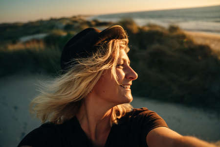 selfie of a traveler on the beach wearing a hat at sunset. high quality photo