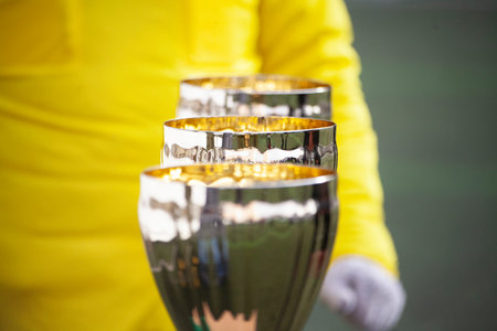 close-up, beautiful gold and silver cups, awards for outdoor cycling competition. High quality photo