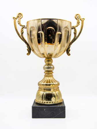 Motivational and inspirational concept about progress and achievement. A gold trophy on white coloured background.