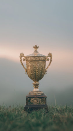 Elegant antique trophy cup on a grassy field at sunrise with a misty background.