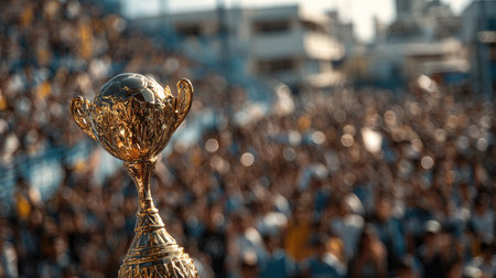 A stunning trophy gleams in the foreground, symbolizing achievement amidst a vibrant crowd celebrating their team's hard-fought victory at a sports event.