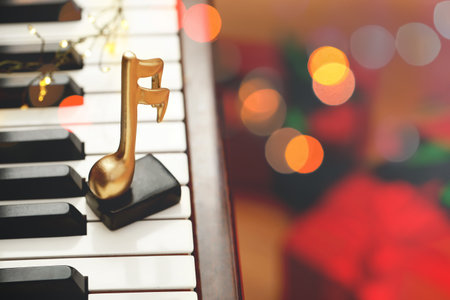Christmas atmosphere. Golden music note on piano against blurred lights, closeup with space for text. Bokeh effect
