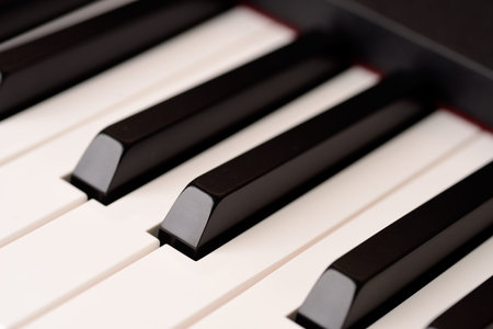 Close up detail on the black and white keys of a music keyboard, with copy space for text