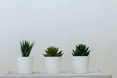 Different Succulents in small white pots on the table. home decor, nordic style design.