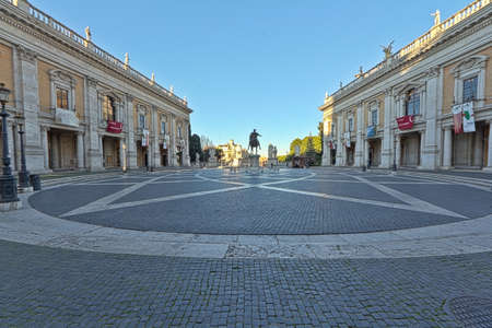 View of an empty Piazza del Campidoglio (Capitoline Hill) with Marco Aurelio statue in Rome Italy