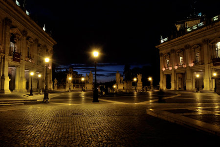 Roma, Italy, 27/11/2019: Front view of the Square of Campidoglio in Rome photographed at night during a rainy day, travel reportage.