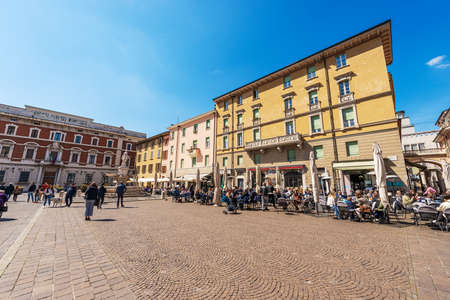 Brescia downtown. The main town square called Piazza Paolo VI or Piazza del Duomo (Cathedral square) of medieval origins with many people. Lombardy, Italy, Europe.
