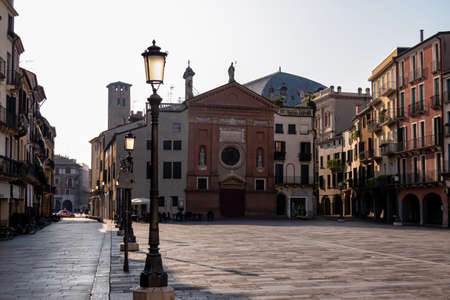 Scenic view in the morning on the empty Piazza dei Signori in Padua, Veneto, Italy, Europe. The street lamps are still on, while the soft early morning light is reaching the center square in Padova