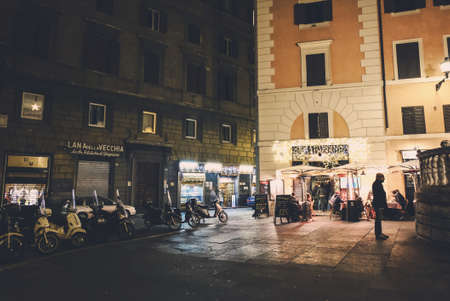 Night life in Rome. People at a restaurant and many scooters parked on the street.