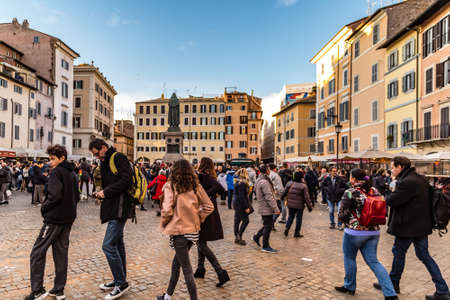 ROME, ITALY - JANUARY 1, 2019: tourists walking in Campo De Fiori and enjoying the wonders of Rome