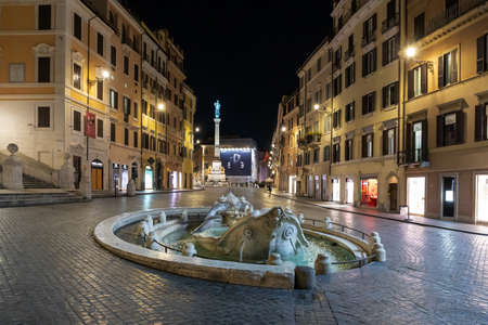 Rome, Italy - March 24, 2020: The Barcaccia fountain in the Piazza di Spagna, illuminated by the light of the street lamps in an unusually deserted city due to the coronavirus emergency.