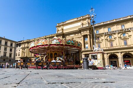 FLORENCE, ITALY - JULY 17, 2016: View of the Piazza della Repubblica and the Carousel Antica Giostra Toscana on July 17, 2016. Its a popular landmark in the city center of Florence.