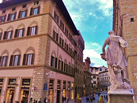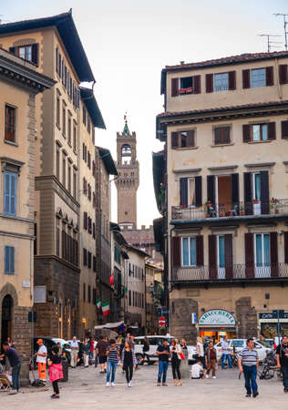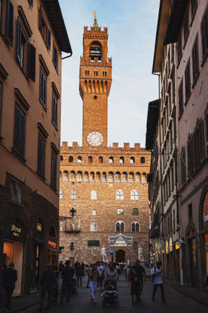 Florence, Italy - October 2019: A walk street leading to the Palazzo Vecchio, the town hall of Florence, located on the Piazza della Signoria (Signoria square) in the old town Florence, Italy