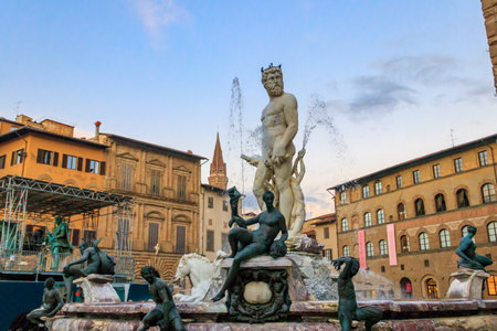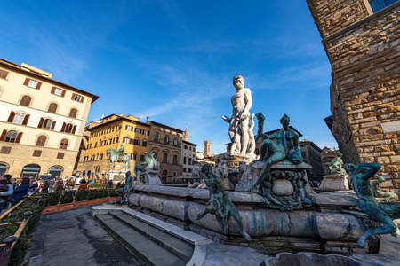 Florence, Italy - August 11, 2021: Renaissance Fountain of Neptune, erected in 1565 in Piazza delle Signoria Square, Firenze