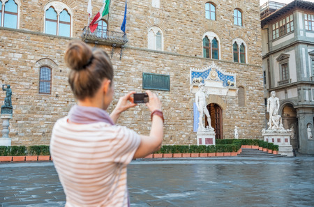 Young woman taking photo of palazzo vecchio in florence, italy. rear view