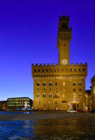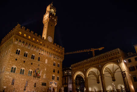 Night view of Florence Palazzo Vecchio in Piazza della Signoria in Florence, Italy. Architecture and landmark of Florence.