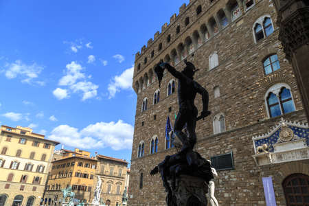 Michelangelo's David statue located in Piazza della Signoria in Florence, Italy.Palazzo Vecchio. Perseus statue with the head of Medusa , in Loggia de' Lanzi, Piazza della Signoria, Florence. Sculptor Benvenuto Cellini (1545-1554).Florence, Italy