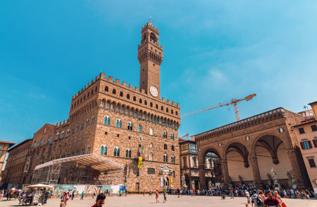 Florence, Italy - May 03, 2018: Palazzo Vecchio building with clock tower overlooks Piazza della Signoria square.