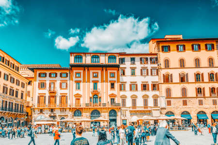FLORENCE, ITALY - SEPTEMBER 22, 2015 : View of Piazza Della Signoria in Florence, with people and sculptures around, on cloudy blue sky background.