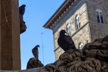 Pigeons sitting on a statue in the old town, Tuscany, Italy