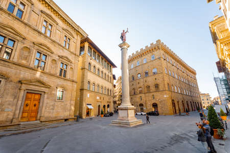 Morning view on Piazza Santa Trinita, triangular square, in Florence city. Travel italian cities of Tuscany. Italian Renaissance architecture