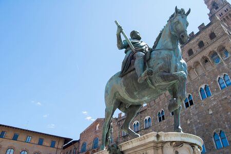 Florence, Italy - August 4 2013: The statue of Piazza della Signoria Florence in Tuscany. Man on horseback, bronze sculpture. Equestrian statue of Duke of Florence and Grand Duke of Tuscany Cosimo I of Medici, family of Medici, bronze of 1594, by Giambolo