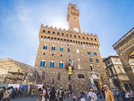 Florence, Italy - August 06, 2017: Palazzo Vecchio with lot of tourists in Florence, Italy, wide shot