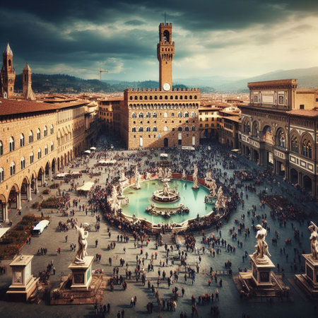 Piazza della Signoria and Fountain of Neptune in Florence. Piazza della Signoria is the square in front of the Palazzo Vecchio, gateway to Uffizi Gallery, and Loggia della Signoria