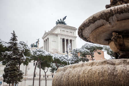 A lovely day of snow in Rome, Italy, 26th February 2018: a beautiful view of Altare della Patria and Fontana dell'Aracoeli under the snow