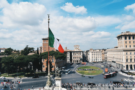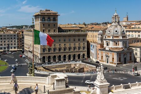 Rome, Italy - Aerial view of Piazza Venezia (Venice Square) and Via del Corso, the main street in the center of Rome. View from the top of the Altare della Patria (Altar of the Fatherland).