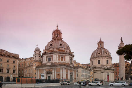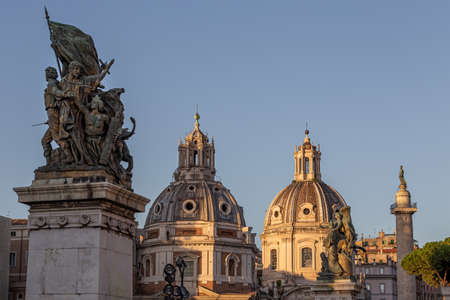 Rome, Italy - October 8, 2020: View of Venetian Square with domes of the churches Santa Maria di Loreto and Church of the Most Holy Name of Mary, Trajan's Column