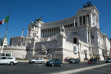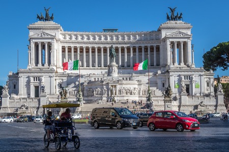 Street view with National Monument to Victor Emmanuel II in Rome, Italy.