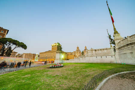 Christmas tree in square in front of Altar Of The Fatherland, known as the national Monument to Victor Emmanuel II at sunset in Rome, Italy