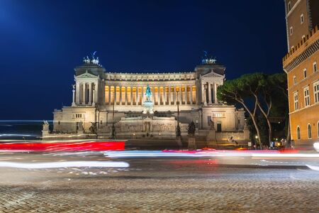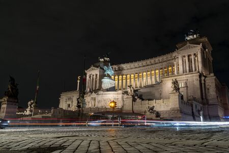 The monument of Vittorio Emanuele II in central Rome illuminated at night with light trails from the passing traffic