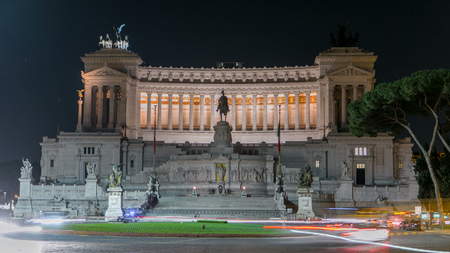 National monument of Victor Emmanuel II at night and road traffic timelapse, Rome. Illuminated building
