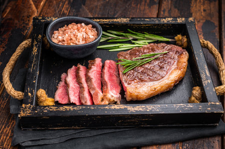 Deliciously charred grilled New York strip or striploin steak with rich marbling, an essential dish for any outdoor gathering. wooden background. top view.
