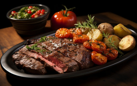 Succulent grilled picanha surrounded by colorful side dishes., generative AI