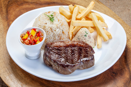 Grilled beef steak with french fries, salad and sauce on wooden background