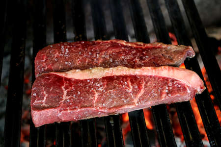Beautiful juicy Picanha closeup with grill marks on top of the grill with glowing coal on the background