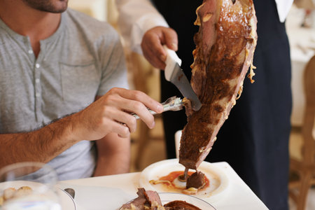Men love their meat. A waiter cutting meat off a skewer at a diners table.