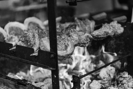 Spit roasted lamb meat on charcoal grill in a restaurant